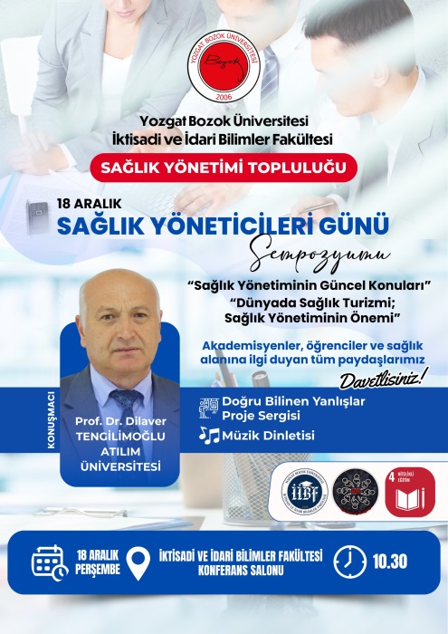 Fakültemiz Sağlık Yönetimi Bölümü tarafından 18 Aralık Sağlık Yöneticileri Günü kapsamında düzenlenecek olan etkinlikte, Prof. Dr. Dilaver Tengilimoğlu konuşmacı olarak yer alacaktır. Etkinlik programında ayrıca müzik dinletisi ve öğrenciler tarafından hazırlanan “Sağlık Yönetiminde Doğru Bilinen Yanlışlar” proje sergiside bulunmaktadır.