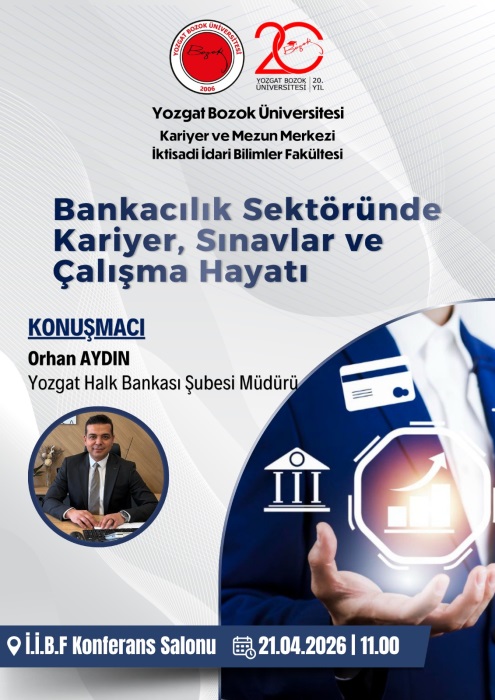 Kariyer Planlama Dersinin etkinliği Halkbank Yozgat Şube Müdürü Sayın Orhan Aydın'ın katılımıyla 24.04.2026 saat 11:30'da fakültemiz konferans salonunda yapılacaktır.