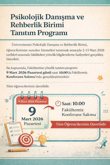 Üniversitemiz Psikolojik Danışma ve Rehberlik Birimi tarafından, öğrencilerimize sunulan psikolojik danışmanlık ve rehberlik hizmetlerinin tanıtılması amacıyla 2–13 Mart 2026 tarihleri arasında fakültelere yönelik bilgilendirme faaliyetleri planlanmıştır.