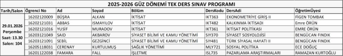 2025-2026 Güz Dönemi Tek Ders SınavlarıGüz dönemi tek ders sınavları 29.01.2025 Perşembe günü saat 13.30'da 104 no'lu sınıfta yapılacaktır. 25.01.2026 15:42