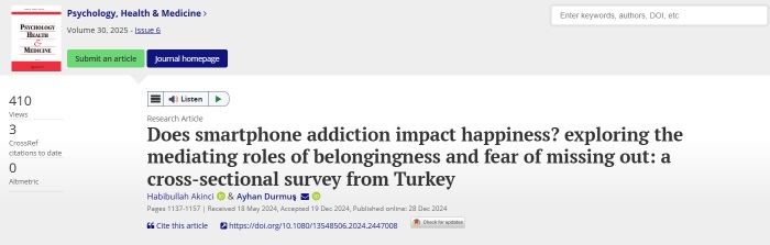 Akıncı, H., & Durmuş, A. (2025). Does smartphone addiction impact happiness? Exploring the mediating roles of belongingness and fear of missing out: A cross-sectional survey from Turkey. Psychology, Health & Medicine, 30(6), 1137–1157.