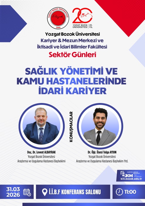 Kariyer Planlama Dersinin etkinliği Araştırma ve Uygulama Hastanesi Başhekimi Sayın Doç. Dr. Levent Albayrak ve Başhekim Yardımcısı Sayın Dr. Öğr. Üyesi Tolga Aydın'ın katılımıyla 31.03.2026 saat 11:30'da fakültemiz konferans salonunda yapılacaktır.